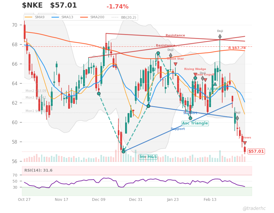 $NKE is printing the classic setup of a value trap: $57.01 sits brutally oversold with RSI at 28.4 and price wedged below both the 20-day and 50-day moving averages, yet the short-term chart is aggressively bullish while the medium-term remains in a downtrend—a divergence that screams capitulation rather than conviction. The real problem isn’t technicals; it’s the fundamental crack underneath: revenue grew 10.3% year-over-year, but earnings actually *fell* 1.9%, meaning Nike is running faster on a treadmill that’s slowing down, and a 6.4% net margin offers almost no cushion for the margin compression already baked into the data. This week’s broader market selloff (Russell 2000 down 4.9%, oil surging 24.75%, crypto collapsing) has dragged $NKE down 6.56%, but the real test comes at $60.80 resistance—if it clears that level on volume, the short-term bounce has legs; if it fails, expect a retest toward the $62.41 moving average, where the earnings deterioration will finally get priced in. Watch whether $NKE can recapture its 50-day at $63.02 next week; if it can’t, this oversold bounce is just a bear trap in a secular downtrend.