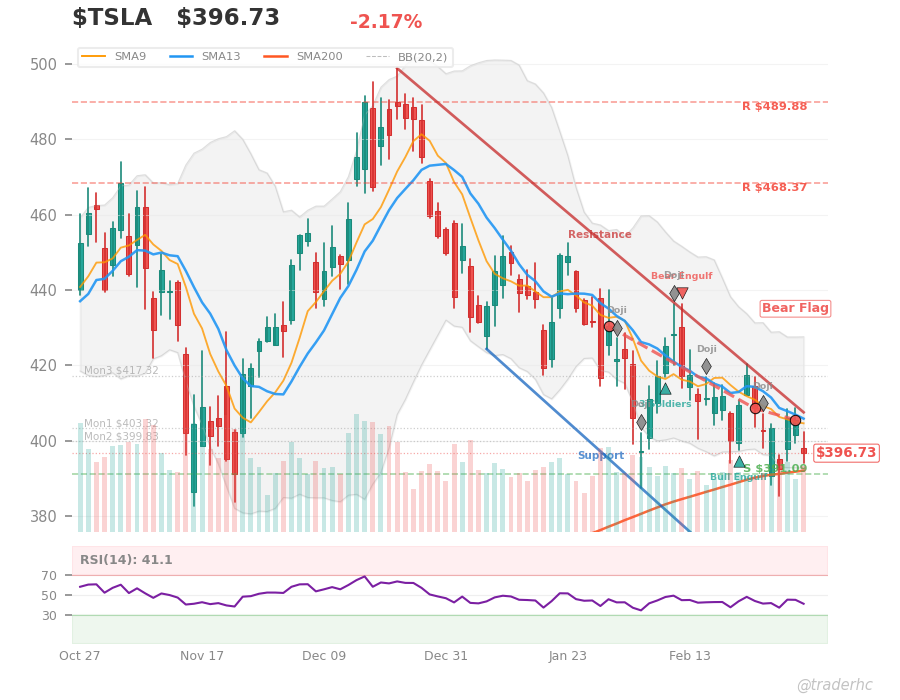 $TSLA is caught in a classic growth-stock contradiction: revenue accelerating 28.8% year-over-year and earnings doubling, yet the stock is trading $31 below its 50-day moving average at $428.01 while the broader market rolls over—$SPY down 2.04%, $QQQ down 1.37%, and oil surging 24.75% on the week, a macro headwind that typically pressures EV demand. The short-term chart is running hot (RSI at 38.1 is neutral, price near the lower Bollinger band, volume elevated at 1.10x average), but the medium-term trend is outright bearish, and the MACD has already rolled over, suggesting momentum is fading into resistance at $468.37. The real tell is the margin story: gross margin at 20.1% and net margin at 3.4% are razor-thin for a company with $24.9B in quarterly revenue, meaning every commodity shock (oil up 24.75%, gold down 3.37%) and every Fed policy hiccup eats into profitability faster than growth can offset it. Watch whether $TSLA can hold the $391.09 support level into next week—a break below that signals the medium-term bearish trend is winning, and the earnings beat becomes noise in a deteriorating macro.