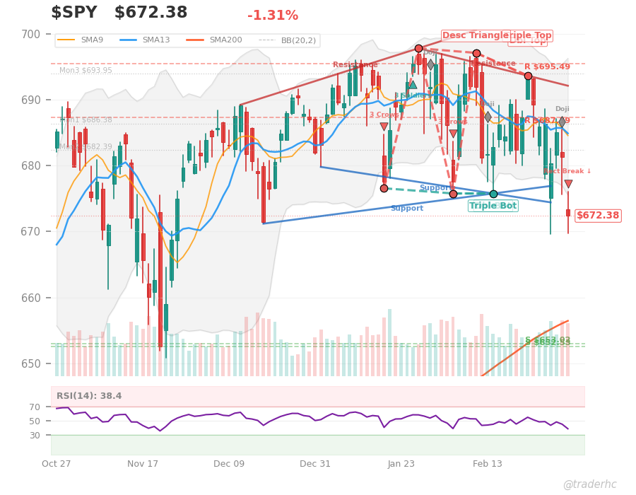 $SPY is trading below both the 20- and 50-day moving averages ($685.92 and $688.05 respectively) while sitting just above the lower Bollinger Band—a setup that typically precedes either capitulation or a violent snap-back, but the MACD bearish crossover and RSI at 42 suggest conviction behind the selling rather than panic. The week’s -2.04% decline is modest relative to the Russell 2000’s -4.90% collapse, meaning large-cap tech is holding better than small-caps, but oil’s explosive +24.75% rally and Bitcoin’s -8.08% drop signal a rotation away from risk assets into energy and commodities, which is eating into equity demand. Watch whether $SPY can hold the $653.02 support level next week—a break below would confirm the bearish bias, but any close back above $687.39 would negate the current sell signal and suggest the dip is a gift.