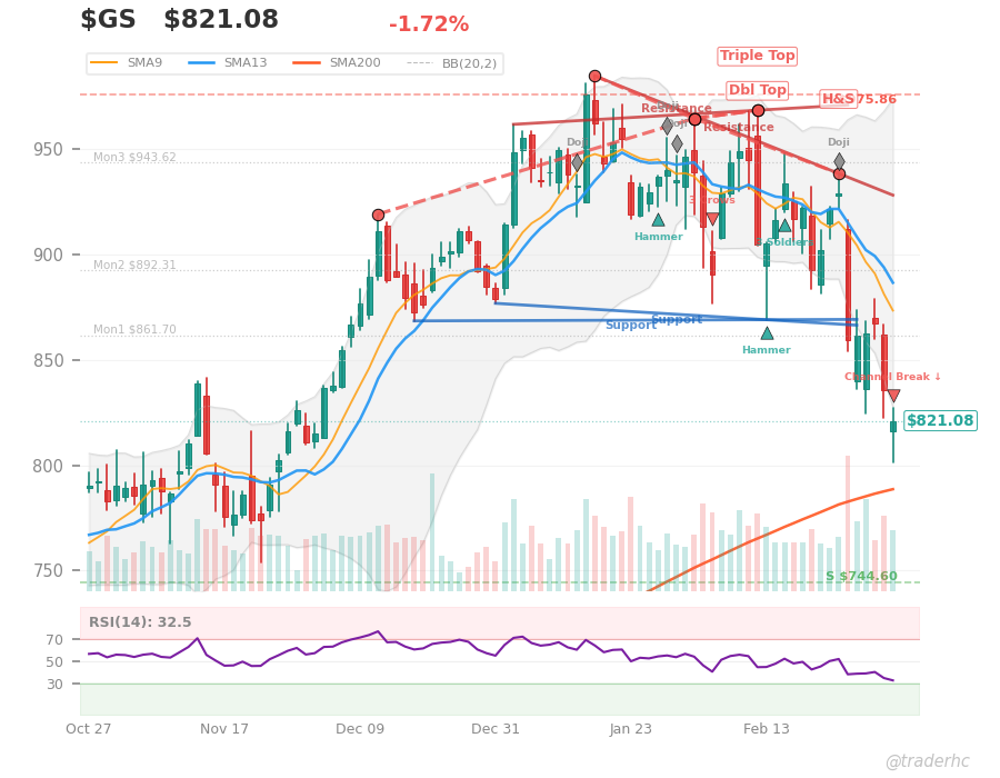 Goldman Sachs is caught in a classic divergence trap: the short-term structure is ripping higher while every structural signal screams weakness, and the fundamentals offer no relief. Revenue collapsed 10.7% year-over-year to $13.45B, and while the 34.3% net margin shows the firm still extracts outsized profits from its client base, the top-line deterioration is undeniable—$GS is pricing in a banking slowdown even as the yield curve steepens (which should theoretically widen net interest margins and benefit the franchise). The technicals expose the fraud: $GS sits below both the 20-day ($900.85) and 50-day ($918.32) moving averages, has fallen 4.71% this week, and is now testing the lower Bollinger band with RSI at 32.6—neutral but vulnerable—while the MACD has already rolled over bearishly, suggesting the short-term bounce has no follow-through. The broader tape isn’t helping either; small-caps ($IWM) are down 4.90% and risk appetite is evaporating as oil surges 24.75% (stagflation signal) and crypto rolls over hard, which typically precedes a flight to safety that pressures financials. Watch the $744.60 support level closely—a break there signals capitulation and a potential 10%+ washout from current levels.