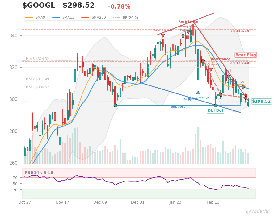$GOOGL is trapped in a classic growth-stock contradiction: revenue surging 26.1% year-over-year to $113.83B, yet the stock is down 2.61% this week and trading $10.26 below its 20-day moving average at $309.08, signaling the market is repricing duration risk as oil screams higher at $108.77 (+24.75% weekly) and long bonds ($TLT) collapse. The technical setup is deteriorating despite the revenue acceleration—RSI sits neutral at 42.3, MACD just rolled bearish, and Bollinger bands position the stock near their lower edge on depressed 0.69x volume, suggesting weak conviction behind any bounce. What’s critical: $GOOGL‘s 30.3% net margin remains fortress-like, but that profitability story is being overwhelmed by the macro narrative of stagflation (growth stocks losing duration premium as real rates grind higher). Watch the $323.44 resistance level next week; a clean break above it would signal the market is rotating back into tech despite the oil shock, but failure to reclaim $309 could trigger a deeper retest toward $236.57 support.