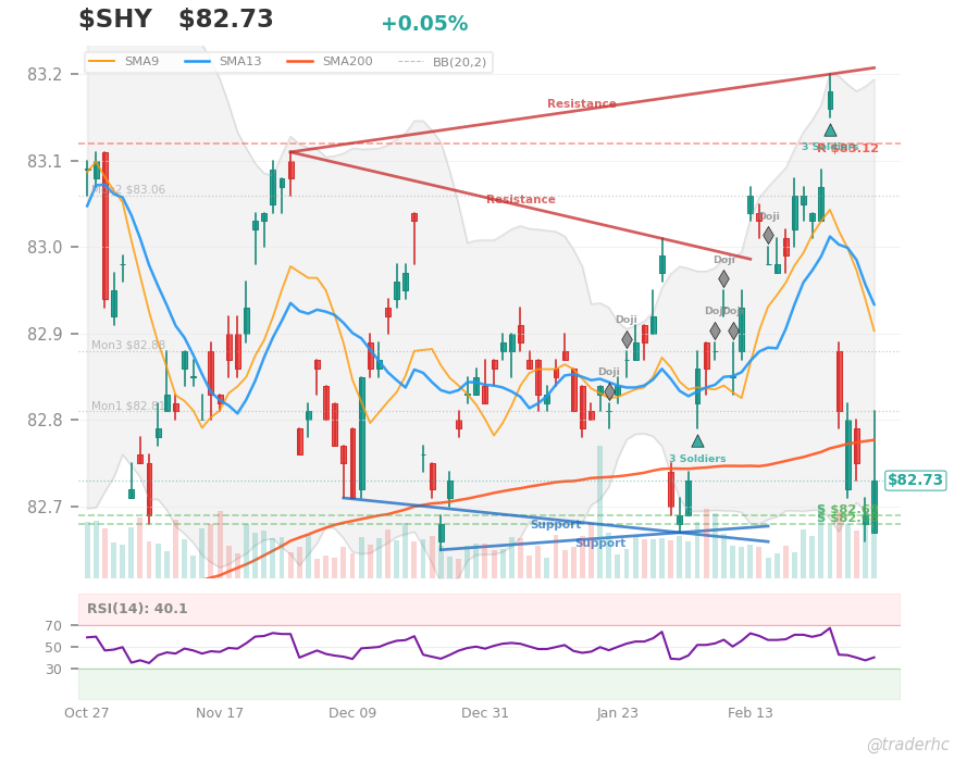 $SHY is sitting in a technical trap: the short-term structure is running hot (price hasn’t broken below support at $82.69), but the medium-term picture is limp—neutral trend, RSI at 30.6, both moving averages overhead at $82.87 and $82.93—and the MACD just rolled over bearish, which is the real tell. The broad market selloff this week ($SPY down 2.04%, $IWM cratering 4.90%) hasn’t dragged short-duration Treasuries down much ($SHY only -0.10%), which suggests safe-haven demand is actually working; the problem is that $SHY‘s own momentum has stalled, and with the Fed funds market still pricing in rate cuts this year, there’s no structural catalyst to push yields lower. Watch whether $SHY holds the $82.69 support level into next week—a break below takes it to $82.68—because if equities stabilize and oil’s $108.77 spike fades, the carry trade could reverse and pull short-duration Treasuries down with it.
