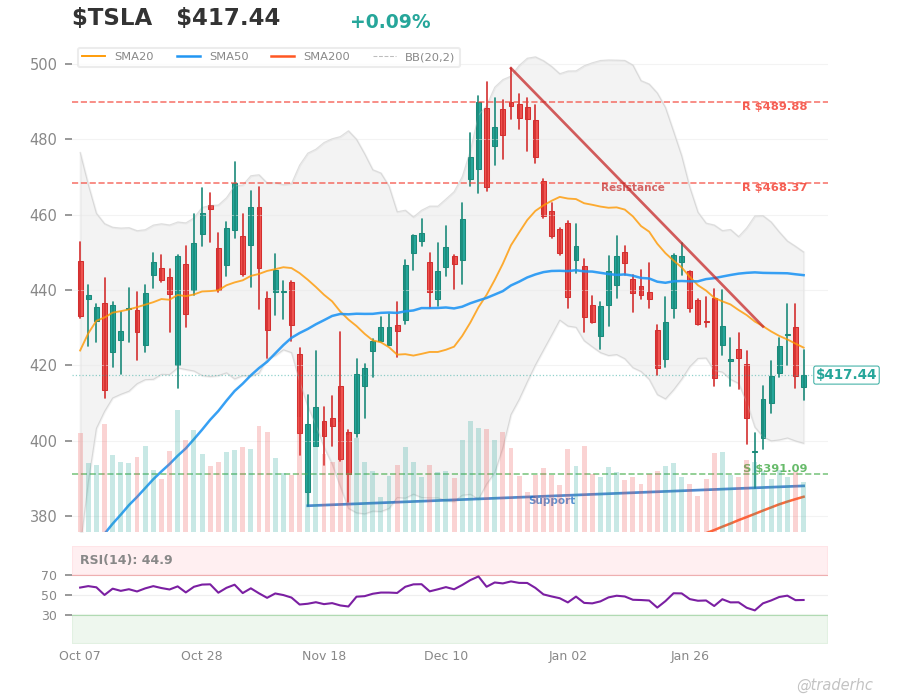 $TSLA carved out a fresh bullish MACD crossover at $417.44, slicing through the short-term downtrend even as the stock lingers below its $424.73 SMA20 and $443.95 SMA50 amid a broader Nasdaq ($QQQ) slide to $601.92. Volume clocked in light at 0.83x average, underscoring neutral RSI footing at 41.9 while medium-term pressures keep it pinned in the Bollinger middle. Watch $391.09 support for any crack that hands reins back to bears next week.
