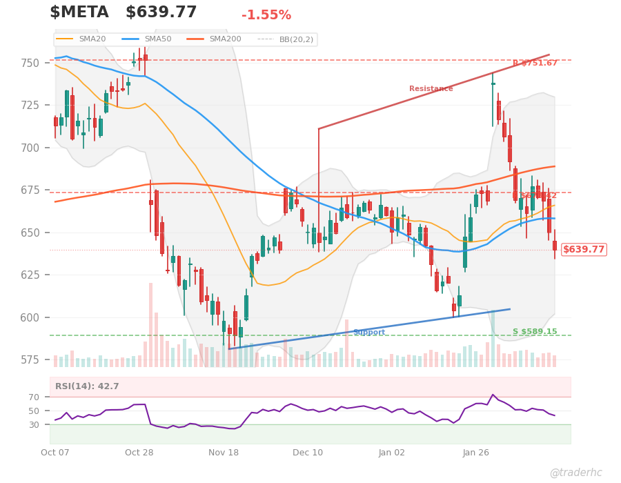 $META carved out a fresh bearish MACD crossover at $639.77, slicing through both its $665.88 SMA20 and $658.19 SMA50 amid tepid 0.65x average volume, exposing downside vulnerability as the Nasdaq $QQQ shed 2.02% this week on rate-sensitive tech pressures. Sitting neutrally in the Bollinger middle with RSI at 42.1, the short-term bullish momentum is fizzling fast in a broader equity pullback, underscoring the stock’s sensitivity to Treasury yields even as $BTC held gains. Watch $589.15 support for the next breakdown trigger.