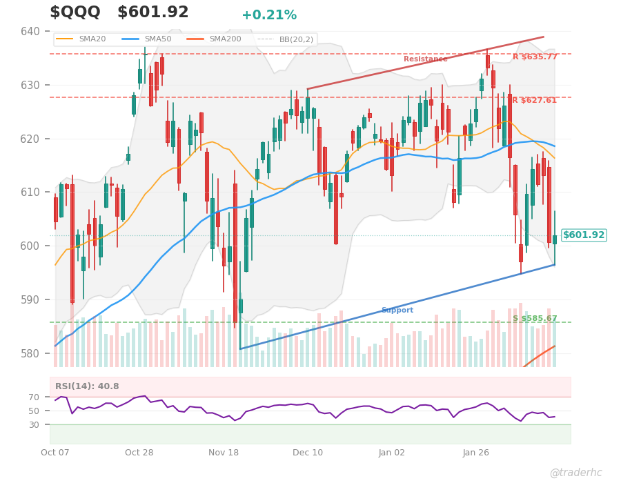 $QQQ hugged the lower Bollinger Band at $601.92 after a -2.02% weekly drop, with volume spiking 1.08x average as sellers piled in below the $616.34 SMA20 and $618.56 SMA50. This medium-term bearish tilt, confirmed by a fresh MACD crossover, echoes widening credit spreads pressuring the broader tape—$SPY down -1.76% and even small-cap $IWM off -1.47%—while bonds ($TLT +2.51%) siphoned risk flows. Watch $585.67 support for the next breakdown trigger.