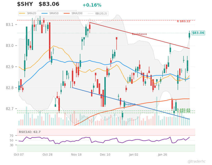 $SHY powered above its upper Bollinger Band at $83.06, signaling short-term momentum even as equities like $SPY and $QQQ shed over 1.5-2% amid risk-off flows. Sitting comfortably above the $82.86 SMA20 and $82.84 SMA50 with neutral RSI at 60, it notched a +0.22% weekly gain versus $TLT‘s sharper +2.51% rally in longer bonds—positioning short-duration paper as low-volatility dry powder tracking Fed expectations. Watch $83.12 resistance for a breakout trigger next week.
