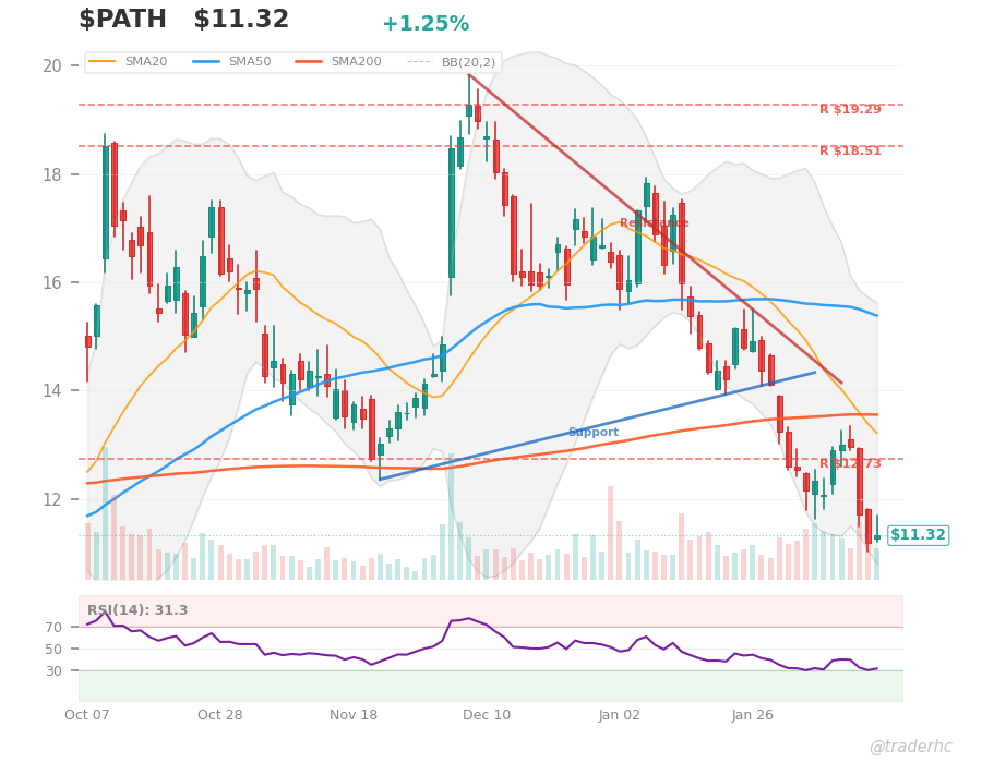 $PATH cratered to an RSI of 20.4, screaming oversold amid a broader tech rout that dragged $QQQ down 2.02% this week while bonds rallied in $TLT. Price lingers near the lower Bollinger Band and well below its $13.21 SMA20 and $15.38 SMA50, with subdued 0.83x average volume underscoring the medium-term downtrend’s grip despite fleeting short-term bounces. Watch $12.73 resistance next week—failure here keeps the bearish bias locked in.