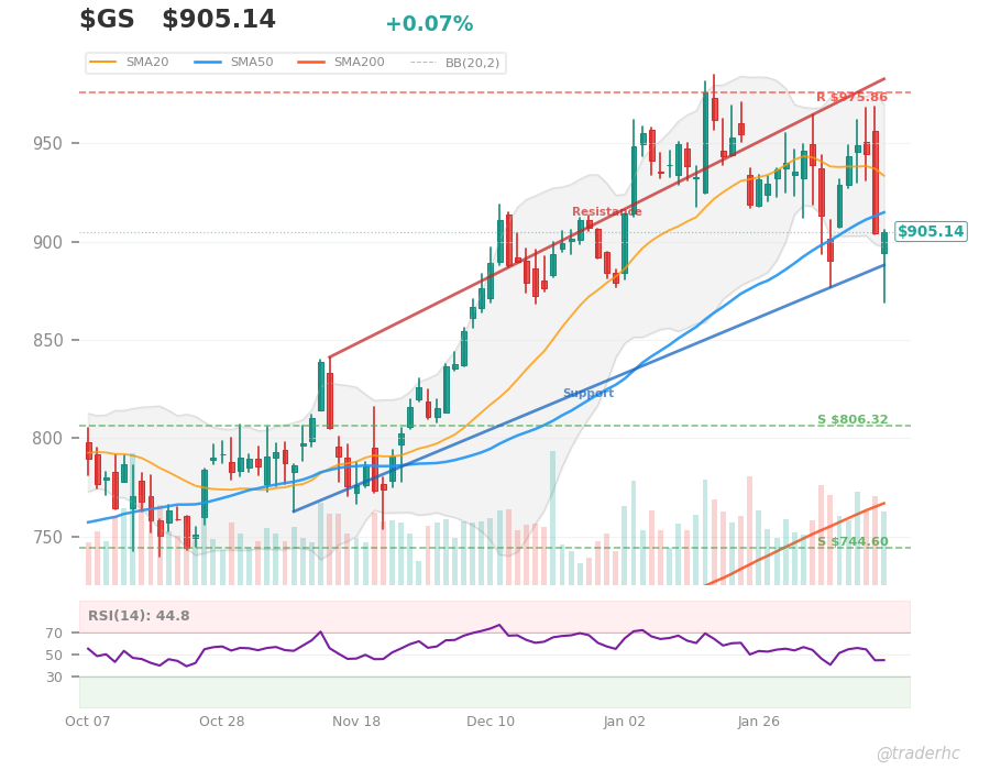 $GS slipped below both its 20-day SMA at $933.52 and 50-day at $914.90, hugging the lower Bollinger Band at $905.14 amid a fresh bearish MACD crossover that underscores the overall selling pressure despite short-term bullish momentum. While banks like $GS should structurally gain from a steeper yield curve boosting net interest margins, the stock’s neutral RSI at 42.9 and volume at exactly average failed to attract buyers as $SPY and $QQQ shed 1.76% and 2.02% this week. A breakdown below $806.32 support opens the path to $744.60, confirming the bearish tilt.