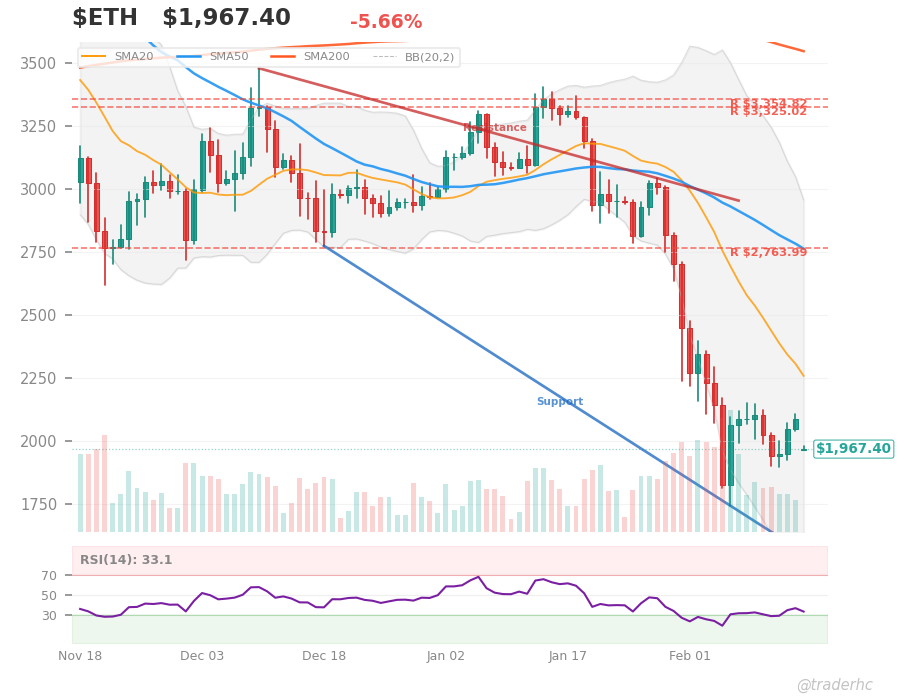 $ETH carved out a fresh bullish MACD crossover at $1967 while grinding +1.44% for the week, defying the broader risk-off spill in $QQQ (-2.02%) and $SPY (-1.76%) as $TLT rallied 2.51% on bond buying. Trading smack in the middle of its Bollinger Bands with neutral RSI at 38.5, it’s hunkered below the $2257 SMA20 and $2762 SMA50 amid a medium-term downtrend, yet holding firm versus $BTC‘s +2.63% bounce as Fed liquidity whispers support reflexive crypto-Nasdaq ties. Watch $2763 resistance next week—break it and $ETH flips convincingly higher.
