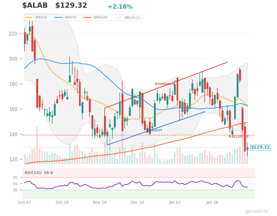 $ALAB cratered to the lower Bollinger Band at $129.32 on 1.24x average volume, underscoring the medium-term bearish momentum as price languishes well below the $161.97 SMA20 and $163.06 SMA50. This setup echoes the broader tech rout, with $QQQ sliding -2.02% amid rising yields pressuring $TLT‘s +2.51% bond rally, even as semis like $ALAB fight short-term upticks in a neutral RSI at 39.4. Watch $139.29 resistance next week—failure here confirms the bearish MACD crossover and opens the trapdoor lower.