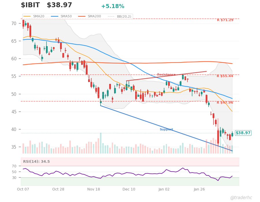 $IBIT plunged to an RSI of 28.2, screaming oversold amid a fresh bearish MACD crossover that underscores its medium-term downtrend, even as spot $BTC climbed 2.63% this week alongside $QQQ‘s risk-asset wobble. Price lingers below the $45.08 SMA20 and $48.73 SMA50 with muted 0.75x average volume, trapping shorts in a short-term bounce that broader bond strength in $TLT refuses to validate. Watch $47.96 resistance next week—failure there keeps the downside bias locked in.